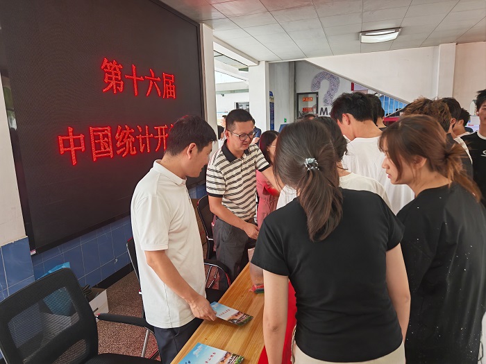 当天下午三点,活动在教学楼广场正式拉开帷幕,工作人员通过设立咨询台、发放《统计法》宣传读本及礼品等方式,吸引往来师生驻足参与。工作人员围绕统计法律法规、数据质量的重要性等内容进行了现场讲解与互动交流,现场气氛热烈,不少学生表示:“原来统计离生活这么近!”