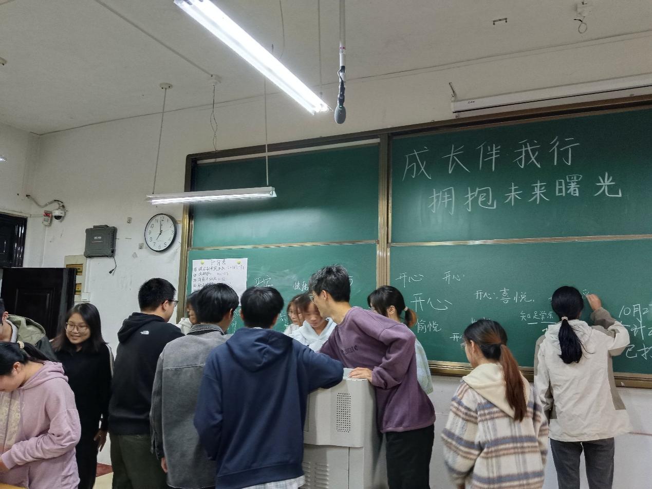 活动尾声,成员们分享了最难忘的片段,在黑板上留下“开心”“快乐”“平安喜乐”等感言,并合影留念。此次活动,以温暖的互动形式,让学生在倾诉、感恩与展望中,收获了心灵的成长,也为校园生活添上了一抹亮色。