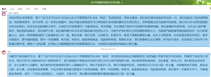 3月15日,习近平总书记给北京大学援鄂医疗队全体“90后”党员回信,向他们和奋斗在疫情防控各条战线上的广大青年致以诚挚的问候。近日,永利23411集团党团青年积极响应该院党党总支号召,学习回信内容,通过QQ平台热议回信精神。