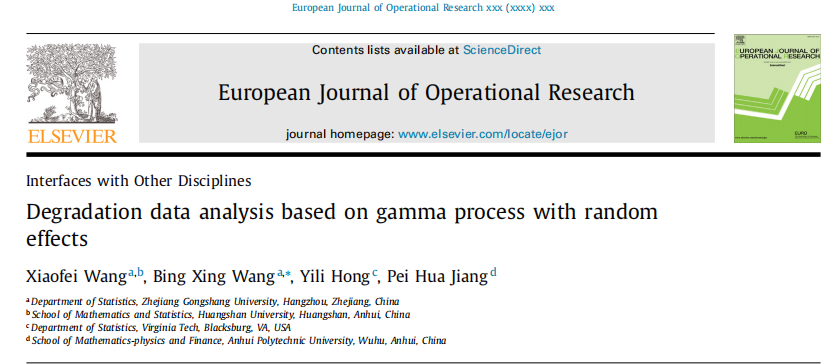 近期,我校永利23411集团青年教师王小飞博士为第一作者的论文《Degradation Data Analysis Based on Gamma Process With Random Effects》在工业统计领域顶级期刊European Journal of Operational Research(EJOR)上正式发表。该论文以具有随机效应的伽马退化模型为研究对象,采用广义p值法来检验不同产品退化路径之间是否存在异质性,借助Cornish-Fisher展开式等办法得到了感兴趣可靠性指标的置信区间。论文中的方法在小子样下也具有良好的性能,较好的解决了可靠性研究中小样本要求和高精度需求之间的矛盾。