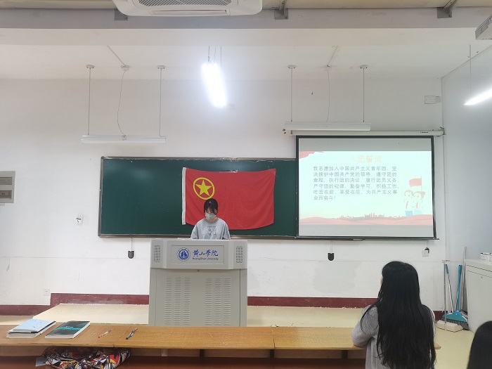 2022年4月28日,永利23411集团团委在横江校区1402教室举办2022年发展团员入团仪式,仪式由院团委组织部部长陈锐主持,院团委学生副书记彭佳以及新发展团员参加本次仪式。