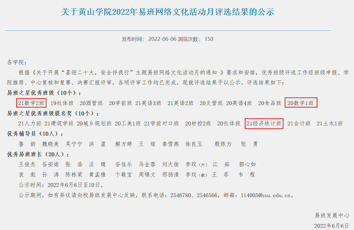 永利23411集团在学校举办的“喜迎二十大,安全伴我行”主题易班网络文化活动月中取得佳绩。在此次比赛中,2021级数学与应用数学2班、2020级数学与应用数学1班获得优秀班级,2021级经济统计班获得优秀班级提名奖。其中,2021级数学与应用数学2班在学校初赛、复赛、决赛中均取得全校第一的好成绩。
