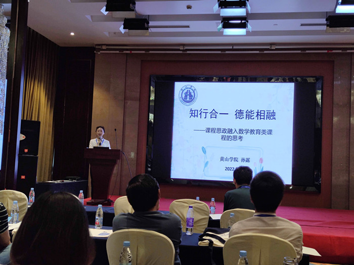 本届年会设有大会报告2个,高校数学科研论坛、高校数学教学论坛与中学数学教育教学论坛3个分组论坛。孙露老师受邀在高校数学教学分组论坛作了题为《知行合一 德能相融——课程思政融入数学教育类课程建设的思考 》的专题报告,介绍了我校数学教育类课程思政建设情况,并基于具体教学案例分享了课程思政导向下如何对徽州优秀传统文化元素进行挖掘与融入,通过重构课程内容体系使其与数学教育类课程进行有机结合,从而达到内化于心、外化于行、知行合一的课程目标,获得了与会者的一致好评。