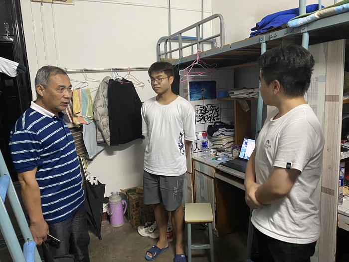 张爱民一行仔细检查了学生宿舍卫生状况及是否存在用电安全隐患等情况,并与同学们进行了亲切交谈。同学们进一步明白了严格遵守学校关于禁止使用大功能电器的规定,是守护生命财产安全的必要举措。敦促同学们疫情防控期间要加强个人防护和卫生保洁,做到勤洗手、多通风、密切关注自身健康状况。同时进一步强调了落实属地管理和校防控办相关规定的极端重要性。未经批准不离校、原则上不离黄、非必要不离皖,严禁前往境外、疫情中高风险地区,非必要不前往疫情发生地、严格落实每日钉钉打卡制度、出入校审批等制度。学院领导班子和辅导员老师们还特意到访重点学生群体宿舍进行检查慰问,询问同学们近期学习和生活状况,并表达了节日问候。检查将结束时,张爱民表示:深入走访学生宿舍、看望慰问重点学生群体必须常态化,维护寝室安全稳定是保障学生身心健康发展的重要一环,也是促进学校改革发展的关键一步。