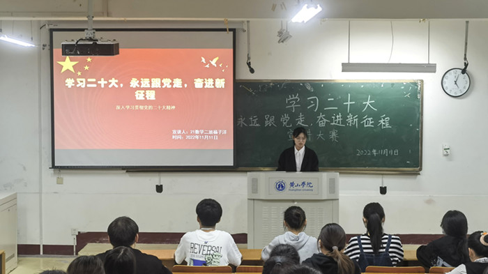 为把广大青年的思想和行动统一到党的二十大精神上来,号召同学们坚定理想信念,紧跟党的步伐,永利23411集团团委于11月下旬在横江校区教学楼1401教室举办了“学习二十大,永远跟党走,奋进新征程”党的二十大精神宣讲大赛。
