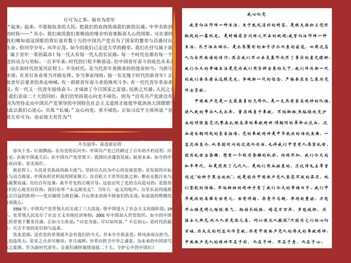 活动得到积极响应,同学们踊跃来稿。来稿中,同学们诉说着对党的感恩和热爱,字里行间都展示出新时代大学生昂扬向上的精神风貌,抒发作为新时代复兴重任担当人,当坚定不移听党话、跟党走,争做奋进不息新青年的情怀。