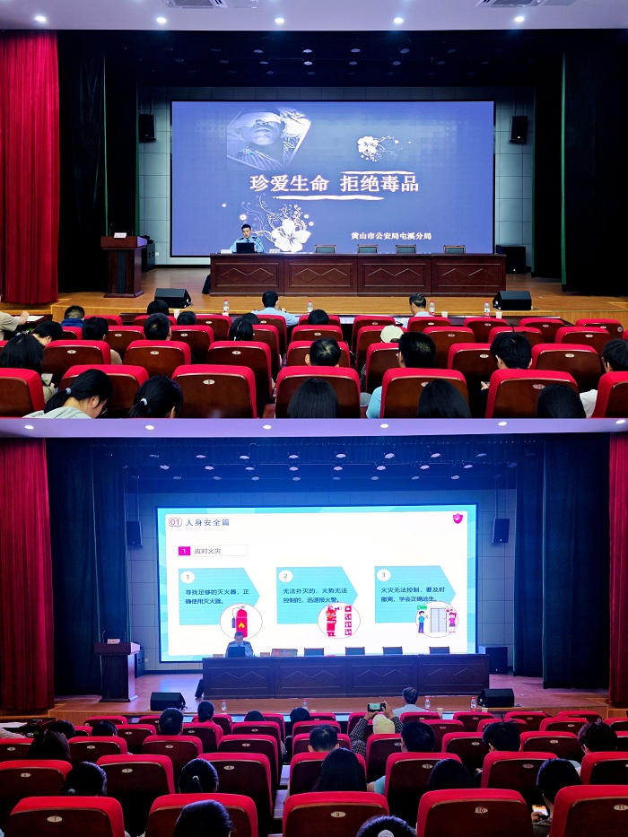 为深入贯彻落实学校关于校园安全的工作要求、提升安全教育宣传效果。5月10日,永利23411集团邀请黄山市公安局屯溪分局国保大队副大队长吴美珠、反电诈中心副主任储佳、禁毒办副主任朱苗苗、治安大队副大队长毕王千里一行共同参与永利23411集团教工党支部主题党日活动,在横江校区报告厅面向永利23411集团广大师生开展安全知识教育普及。