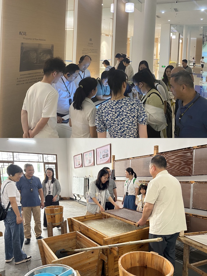 中国宣纸文化园作为人类非物质文化遗产和国家级非物质文化遗产生产性保护示范基地,坐落在泾县榔桥镇乌溪,园区内分为宣纸博物馆和宣纸技艺体验园两个部分。在讲解员的带领下,我院教职工对宣纸的历史发展和制作技艺有了直观了解,并欣赏到2016年生产出的登上了世界吉尼斯纪录的“三丈三”巨宣,该张宣纸长11米,宽3.3米,是超大规格的世界上最大手工宣纸。在宣纸技艺体验园,零距离观摩最传统的宣纸制作过程,感受捞纸、晒纸、剪纸等技艺的独特魅力。我院教职工还在工匠师傅的指导下,亲身体验了捞纸工序的艺术与神奇。郭沫若先生曾题词赞誉:“宣纸是中国劳动人民所发明的艺术创造,中国的书法和绘画离了它便无从表达艺术的妙味”。