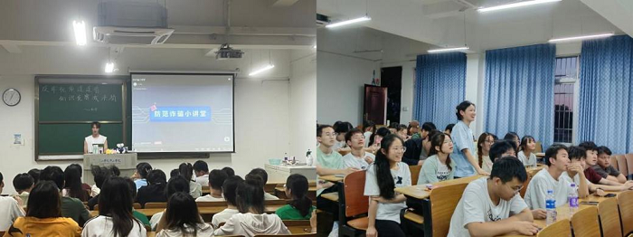 共筑反诈防线,共建无诈校园。9月2日在横江校区教学楼1504举办以下活动,进一步加深同学们对诈骗知识的了解和掌握。本活动主要通过易瞄瞄发布动态和创建优课课群的方式线上线下同步进行。学生在易班优课中提交拍摄的反诈视频作业,与此同时,同学们用诙谐幽默的方式、精彩生动的表演,让观众深刻认识到了诈骗带来的严重危害,号召大家一起加入防诈骗的斗争中。