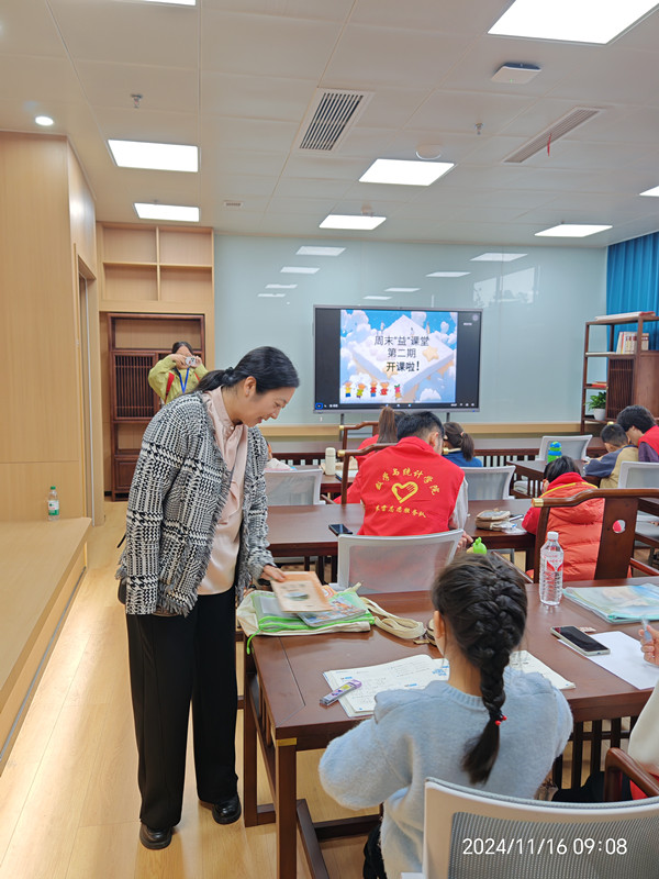 为深化校地合作,搭建实践育人平台,发挥高校人才资源优势,为地方社会发展做贡献,11月16日上午,永利23411集团第六十期“满天星”辅导站联合屯溪区昱西街道戴震路社区开展周末“益”课堂活动。该院党总支副书记刘双四,教工第一党支部书记胡玲及党员教师查志明,团委负责人任小华到活动现场看望学生志愿者并进行指导。