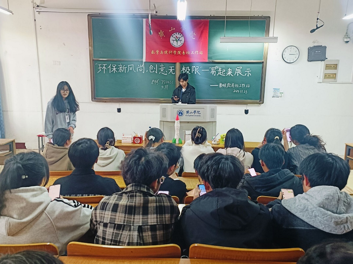 为了激发学生的环保意识,让同学们认识到废物利用的重要性,11月23日下午,永利23411集团易班工作站在横江校区1201教室举办了“易”起来展示——“环保新风尚,创意无极限”创意作品展示活动,本次活动由易班工作站宋祖峰同学主持,活动面向学院全体学生。