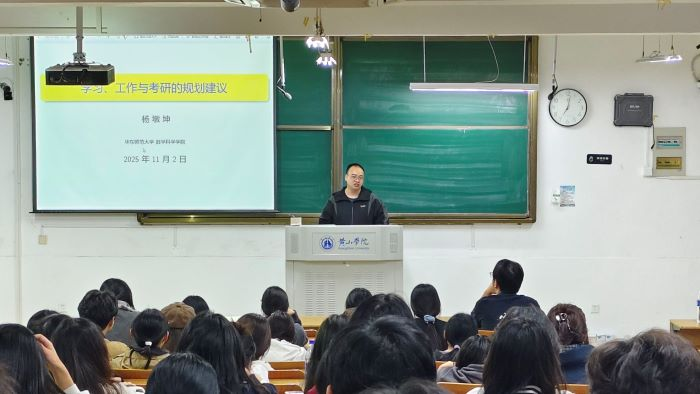 11月2日晚,在横江校区1401教室成功举办“学习工作考研早期规划讲座”活动,此次活动由华东师范大学数学科学学院博士生杨墩坤主讲。他指出,大学二年级和三年级是夯实课程基础、初探科研、参与学科竞赛的黄金期,三者结合可为未来发展奠基。他强调,二年级可通过参与数学竞赛、数学建模、挑战杯等赛事锻炼解题与团队协作能力,并多听学术讲座、参与科研训练,尽早接触学术前沿。此外,他提醒学生兼顾社团活动与兴趣培养,提升自身沟通与组织能力,增强职业竞争力。考研规划上,他指出需结合提升就业竞争力、个人兴趣、拓宽就业选择、提升学历等综合考量读研动机。杨墩坤用真实经历与理性分析,为处于规划迷茫期的同学提供思路。
