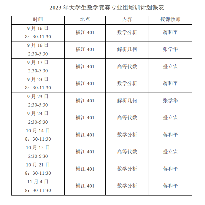 专业组: 横江校区1401教室,9月16日到11月5日周六、周日;