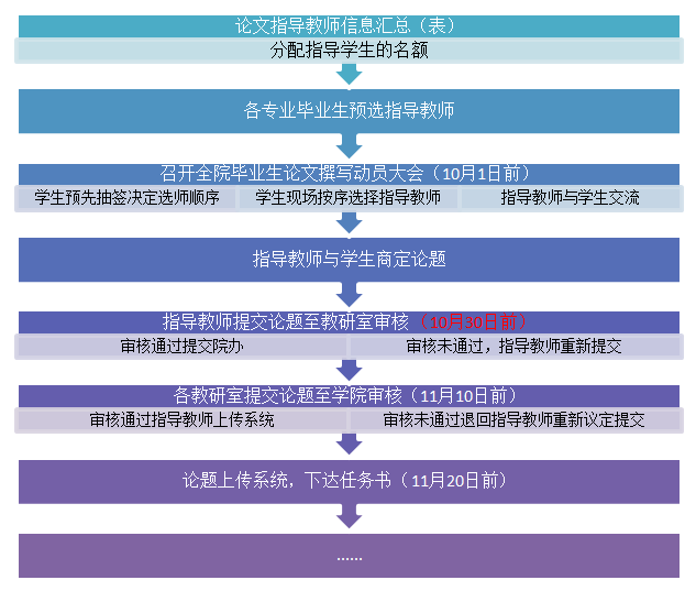 本届学生论文确题事项的基本规则是:先由学生选择指导教师,指导老师再和学生商议论题,提交教研室和学院审核后,确定论题!具体进程示意图如下: