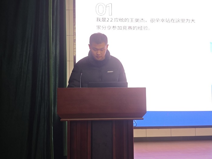 活动现场座无虚席,三位学长依次上台分享。王奥杰以自身参赛项目为例,详细介绍了从选题、团队组建到项目实施的全过程,强调了团队协作和选题创新的重要性。